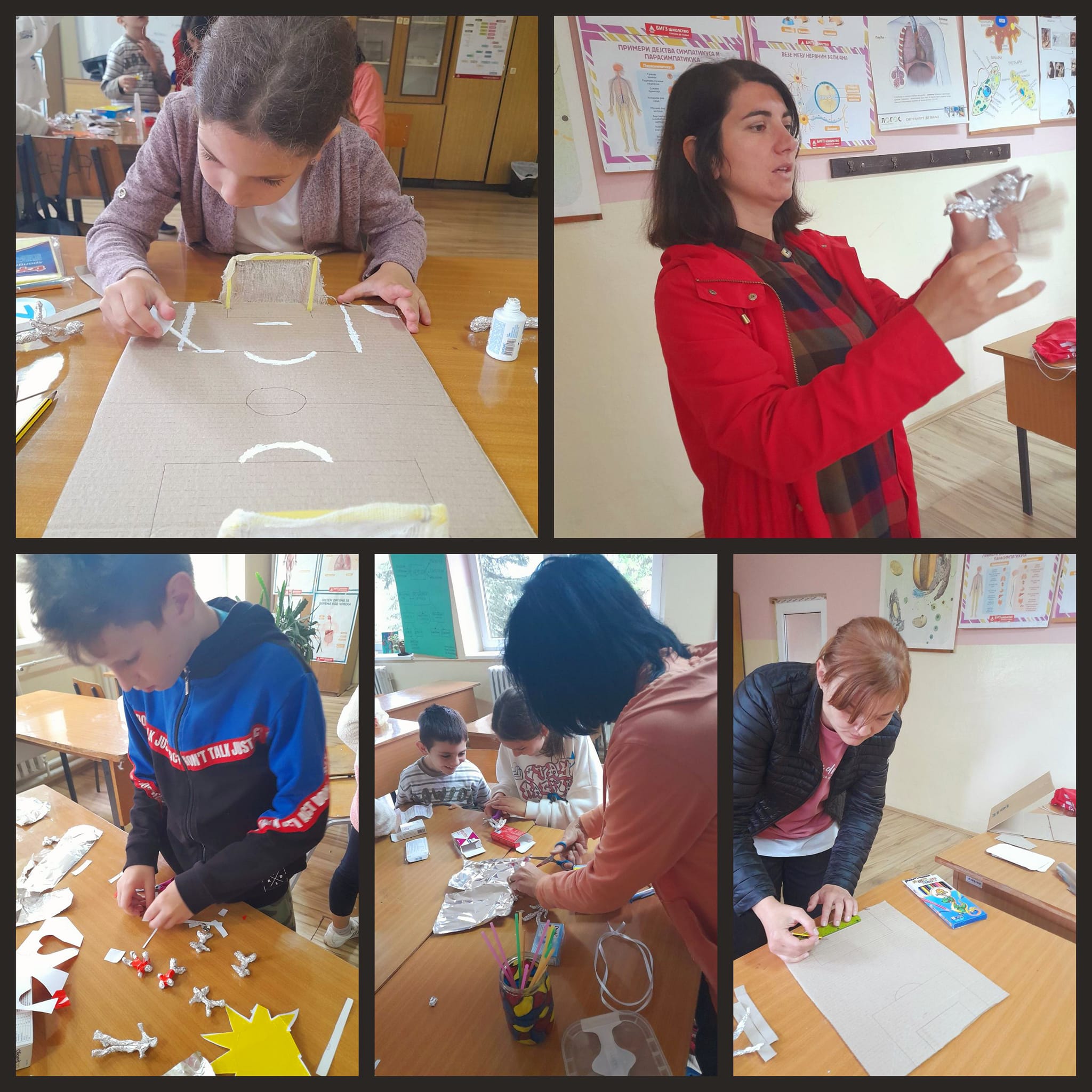 Ученици нижих разреда са својим мало старијим другарима, ученицима 5. разреда, у оквиру данашњих активности израдили су макете спортских терена (одбојкашког и фудбалског), водећи рачуна о сваком детаљу (позицији, боји дреса омиљених играча, правилима игре).