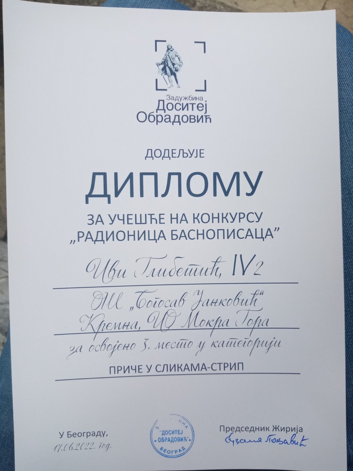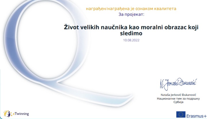 Пројекат "Живот великих научника као морални образац који следимо" чији су аутори Богдан Марјановић - педагог ОШ "Душан Јерковић", Јована Божовић - наставник технике и технологије и информатике у ОШ "Алекса Дејовић" Севојно и Сузана Јездић - наставник музичке културе у ОШ "Богосав Јанковић" Кремна, награђен је eTwinning националном ознаком квалитета.